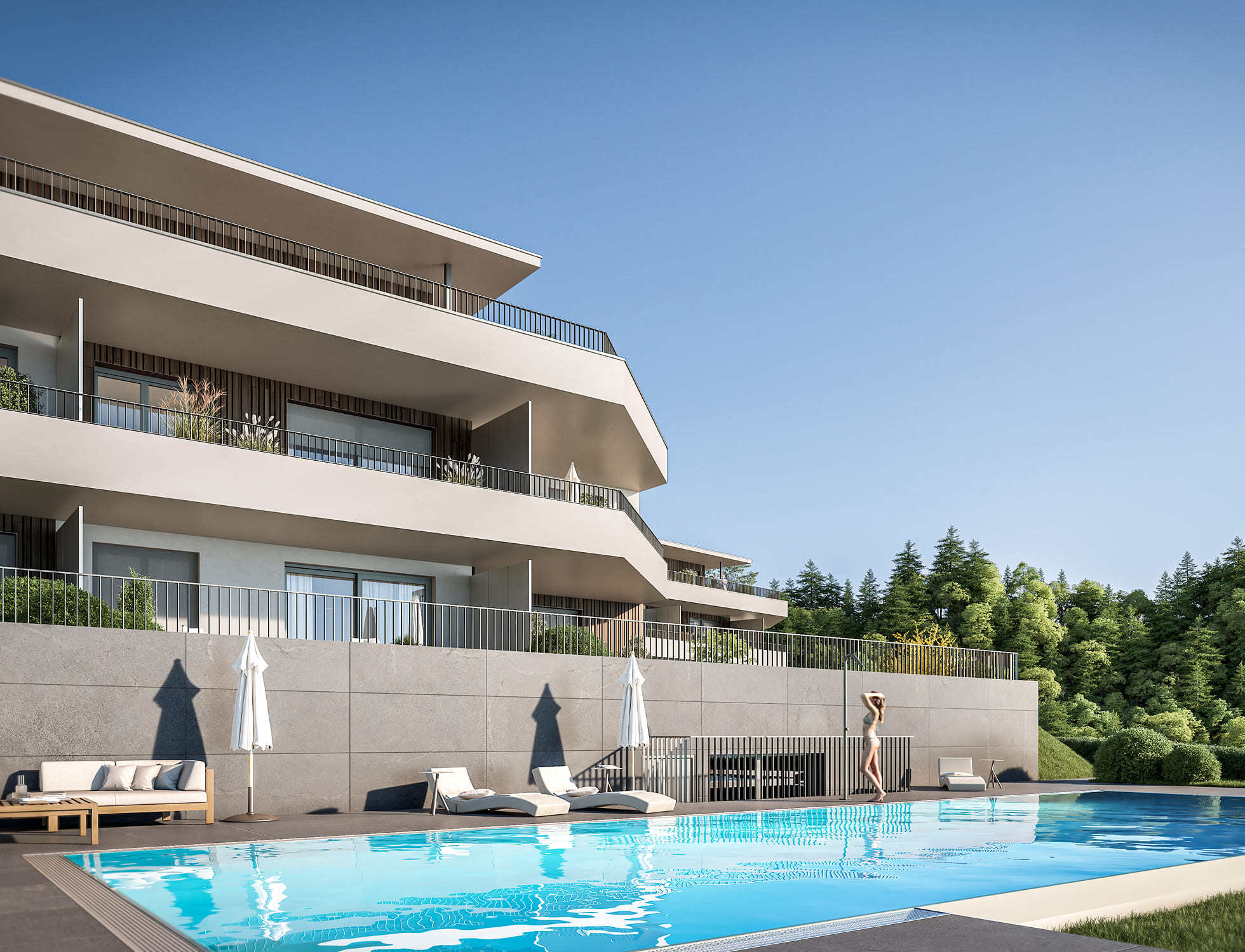 Von jeder Wohnung fällt der Blick frei über den Wörthersee und die Karawanken; Bodentiefe Glasfronten fangen das Licht des Südens ein und schaffen fließende Übergänge zwischen Innen und Außen.